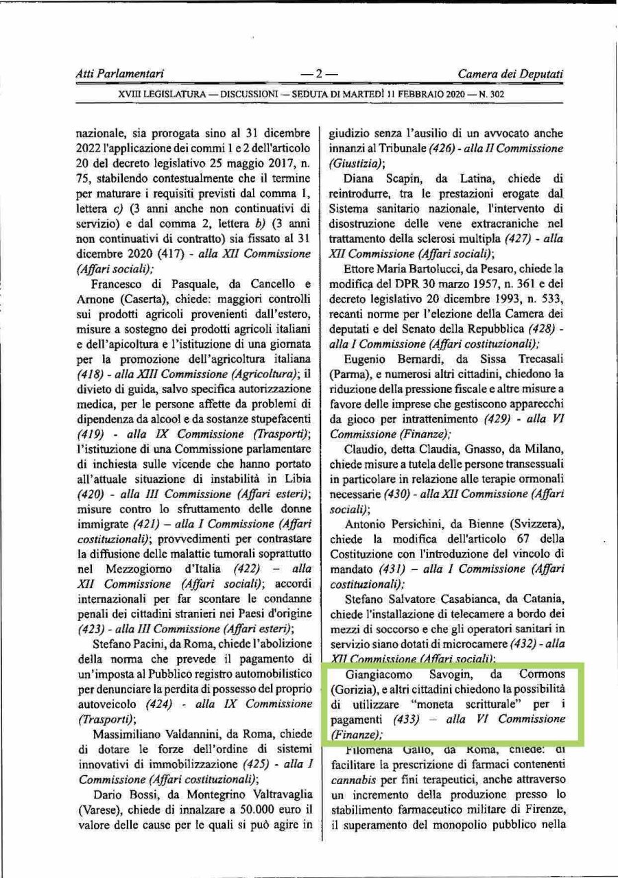 12/02/2020 – Camera Deputati Fissazione Discussione Petizione 433