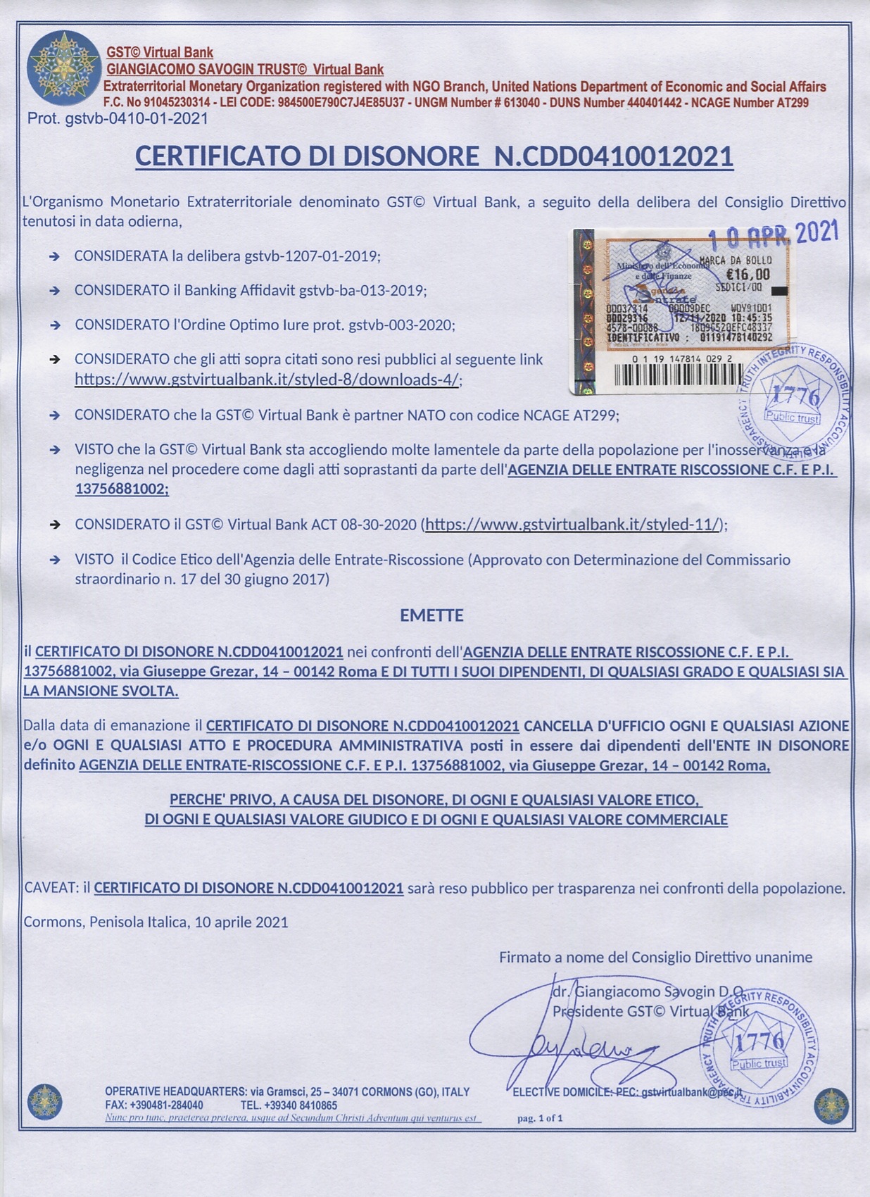 10/04/2021 – Certificato Di Disonore All’Agenzia Entrate Riscossione gstvb-0410-01-2021